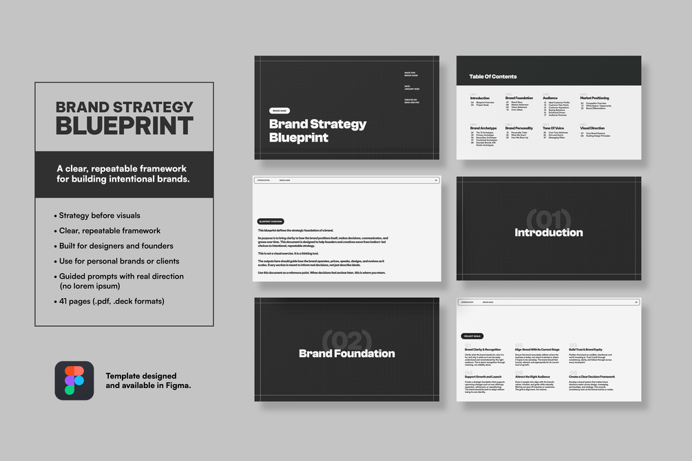A 41-page brand strategy blueprint in Figma (.deck) and PDF formats, with guided prompts, structured frameworks, and synced typography for easy use and reuse.